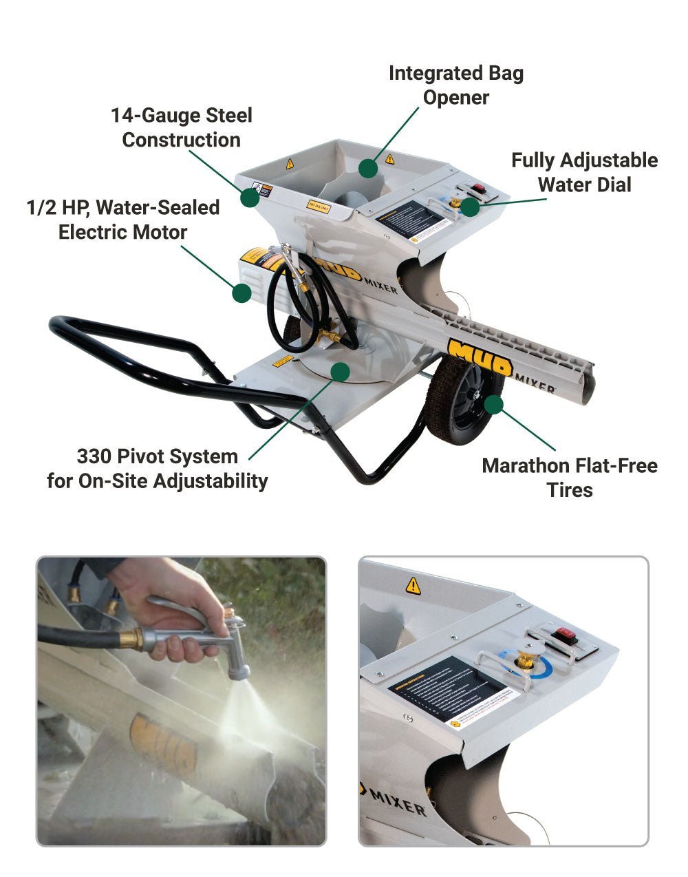 Marathon flat-free tires mean you’ll always get where you’re going. The integrated bag opener provides easy drop-and-fold opening of your favorite dry mix. The fully-adjustable water dial allows for customized water flow for desired mixture. The electric drivetrain provides the power to chew through more than 40 bags of mix per hour.